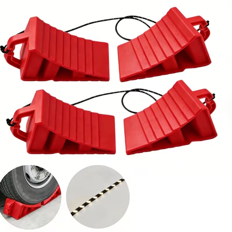 Enhance vehicle stability during parking or maintenance with this 4-piece set of heavy-duty wheel chocks. Designed to help prevent unwanted rolling, these chocks are suitable for use with cars, trucks, trailers, and campers on various surfaces. Made from durable hard plastic, they provide a reliable grip and long-lasting performance in everyday conditions. The integrated handles and connecting rope allow for easy placement and removal, making them a practical addition to your vehicle safety equipment.
